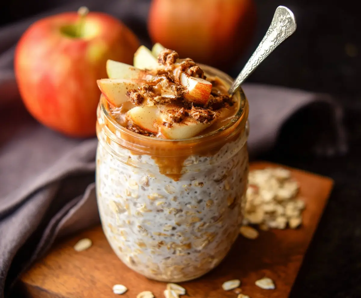 I love how easy these oats are to make. Just mix everything in a jar and let it sit overnight. In the morning, breakfast is ready, and it tastes like a warm apple pie! 🍏✨