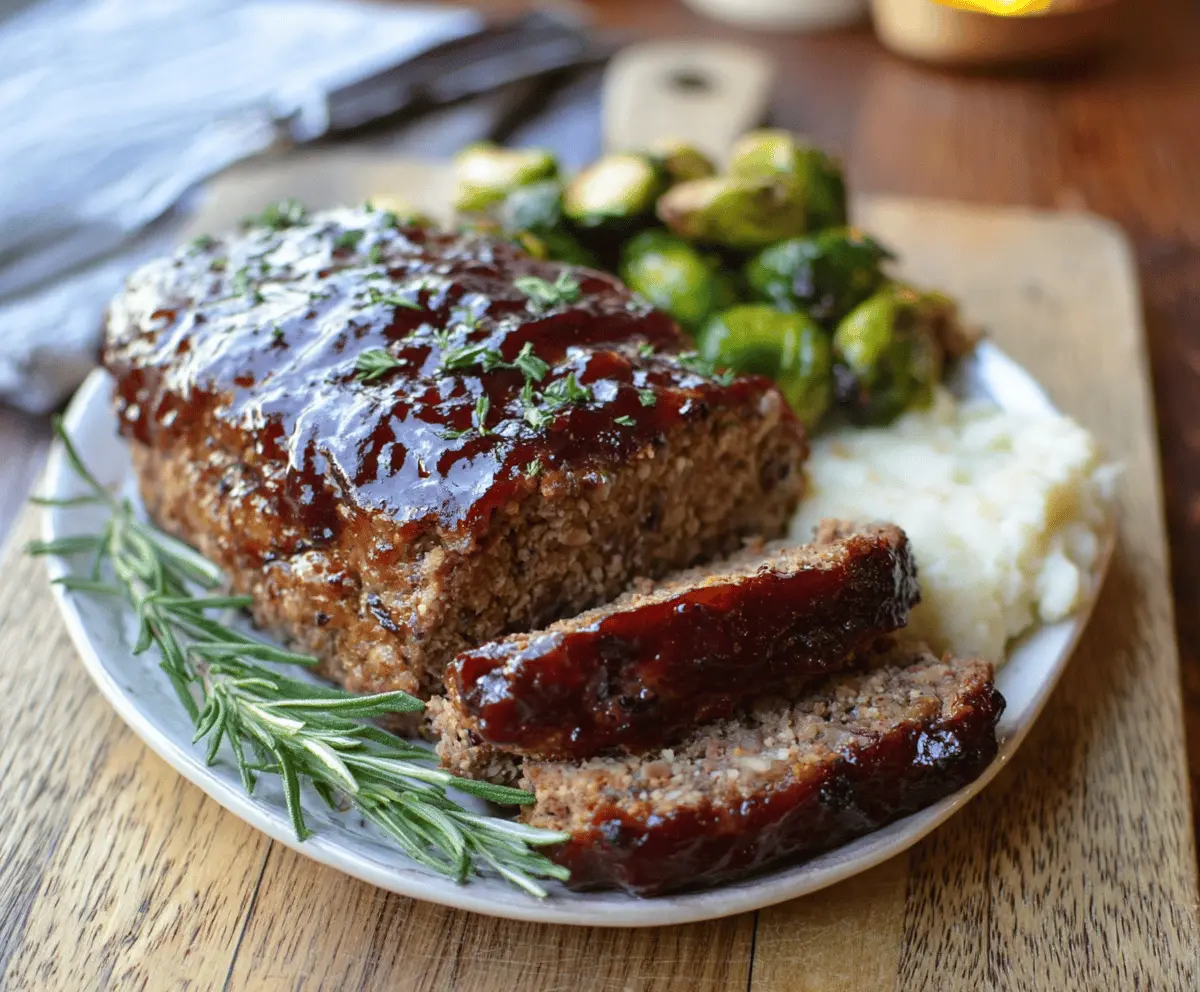 Delicious Balsamic Glazed Meatloaf served on a plate with fresh herbs