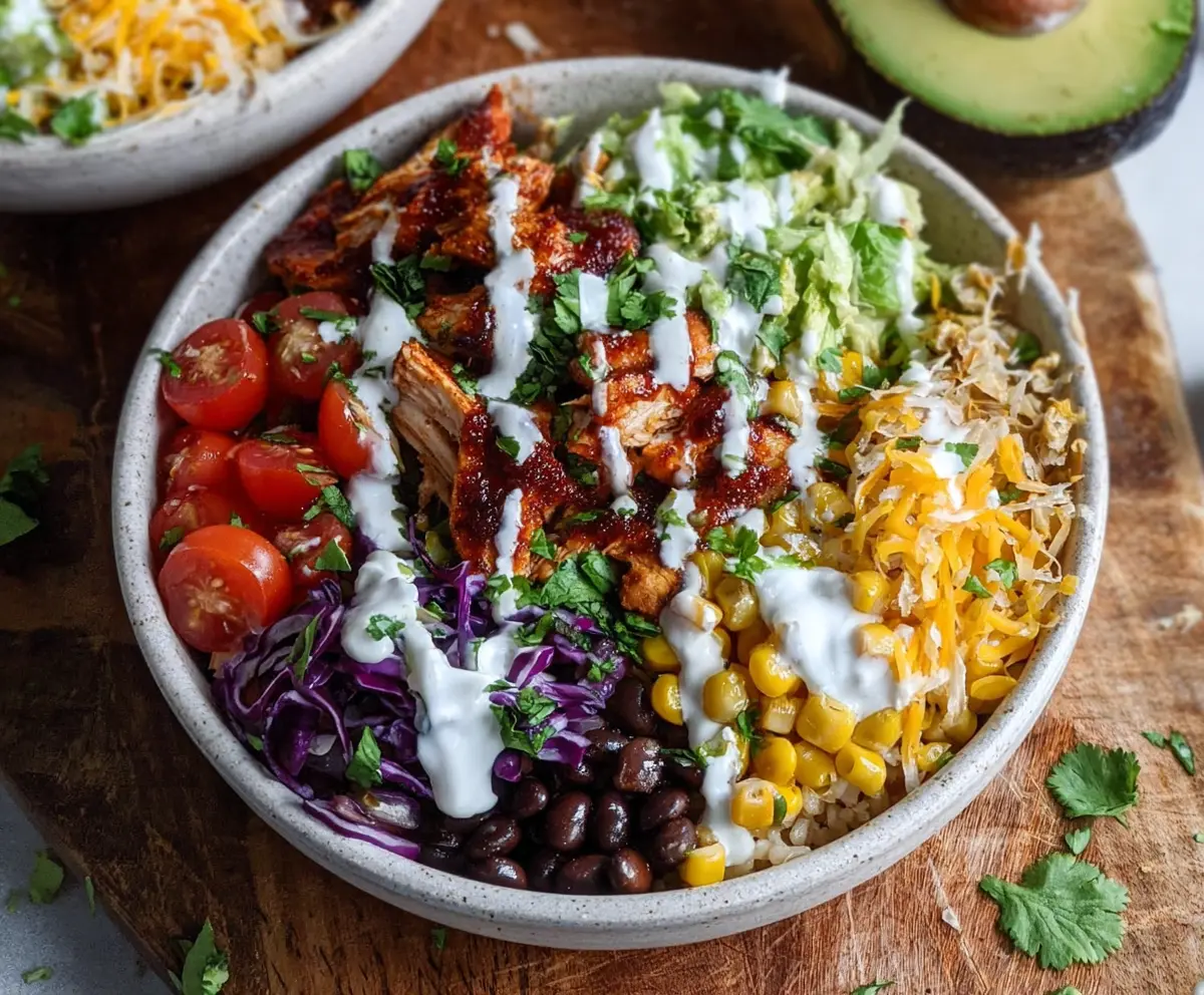 This BBQ Chicken Ranch Bowl is bursting with flavor! It combines juicy chicken, zesty barbecue sauce, and creamy ranch dressing over a bed of rice or greens. Yum!