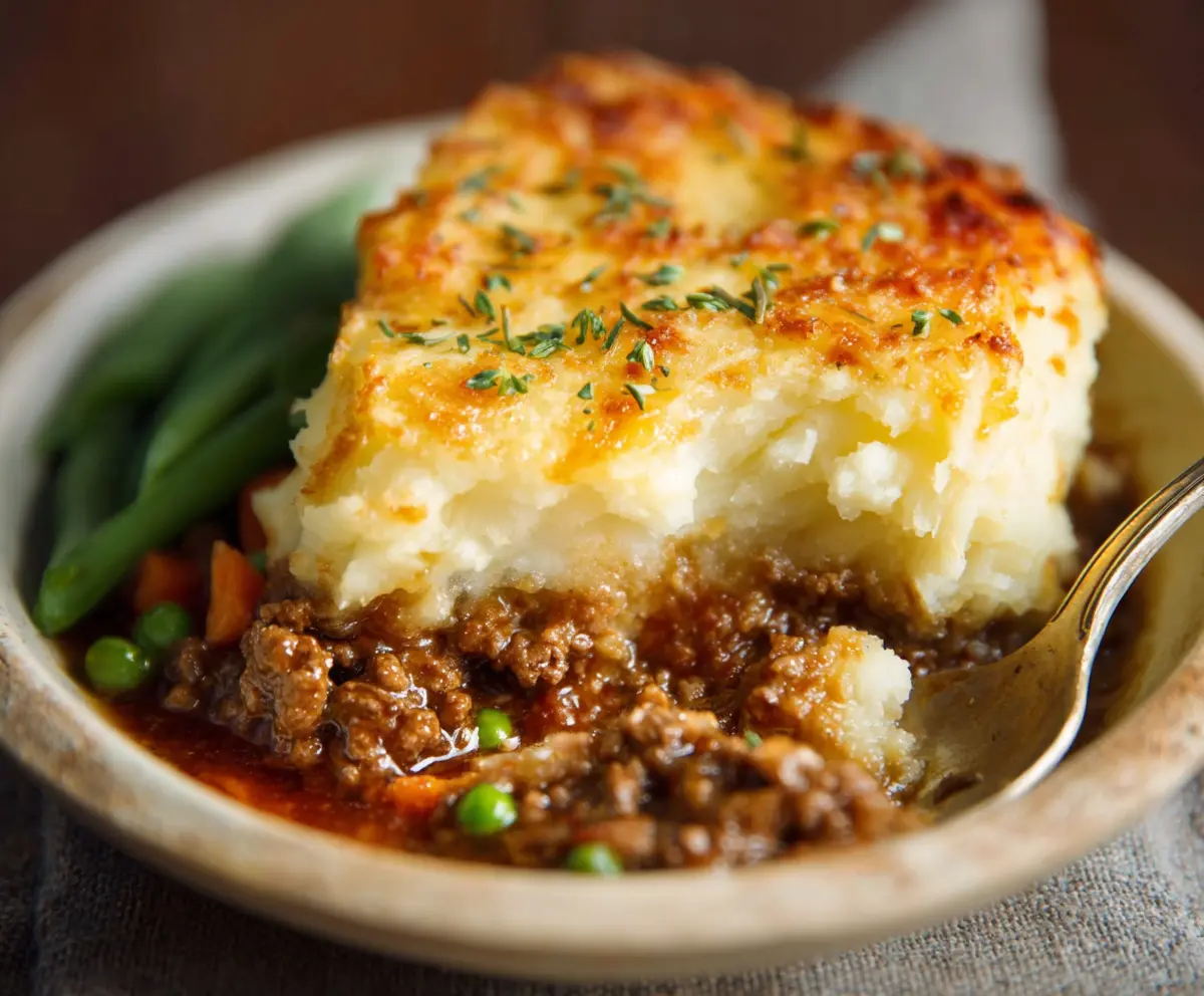 Delicious British Shepherd's Pie topped with golden mashed potatoes and savory beef filling