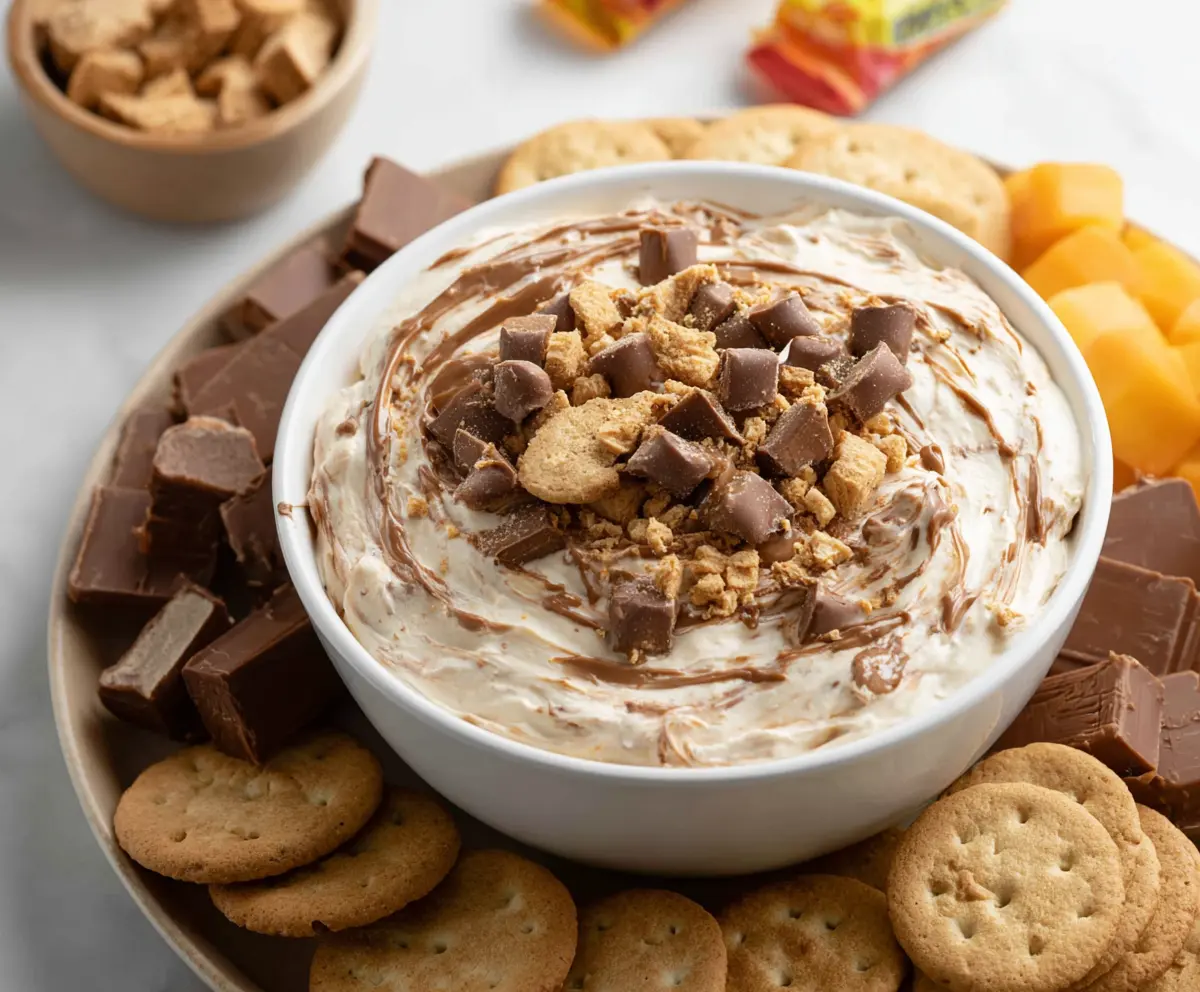 This Butterfinger Dip is a fun and creamy treat that mixes peanut butter, cream cheese, and crushed Butterfinger candy bars. Perfect for snacking or parties!