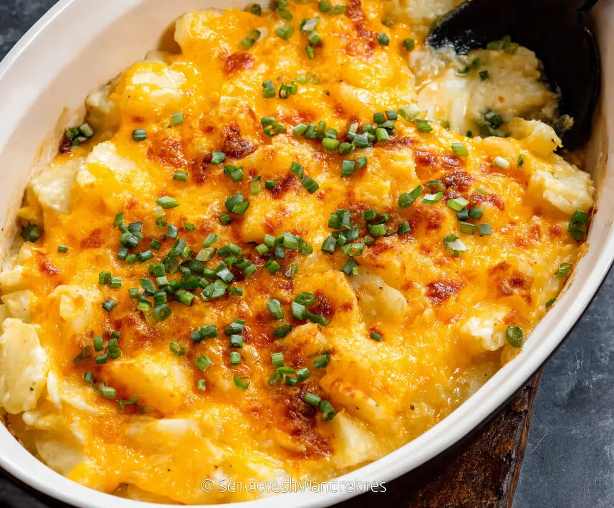 Your creamy, cheesy potato casserole is ready! Serve it warm as a delicious side dish or even as a main course. Enjoy!