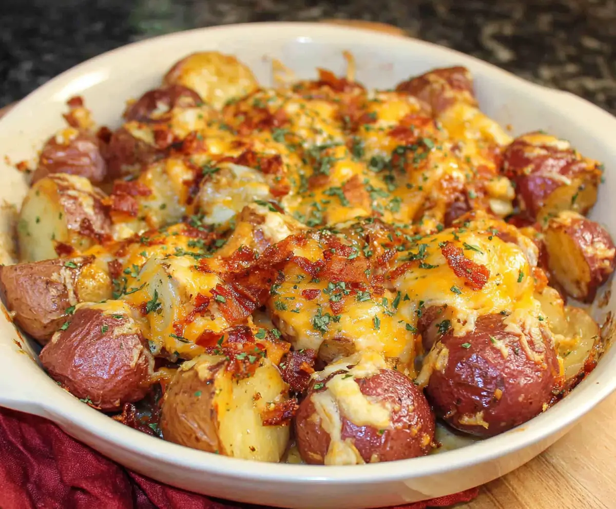 To make these cheesy red potatoes vegetarian, simply omit the bacon. You can enhance flavor by adding additional vegetables like bell peppers, mushrooms, or spinach. A sprinkle of smoked paprika can also give a similar depth of flavor!