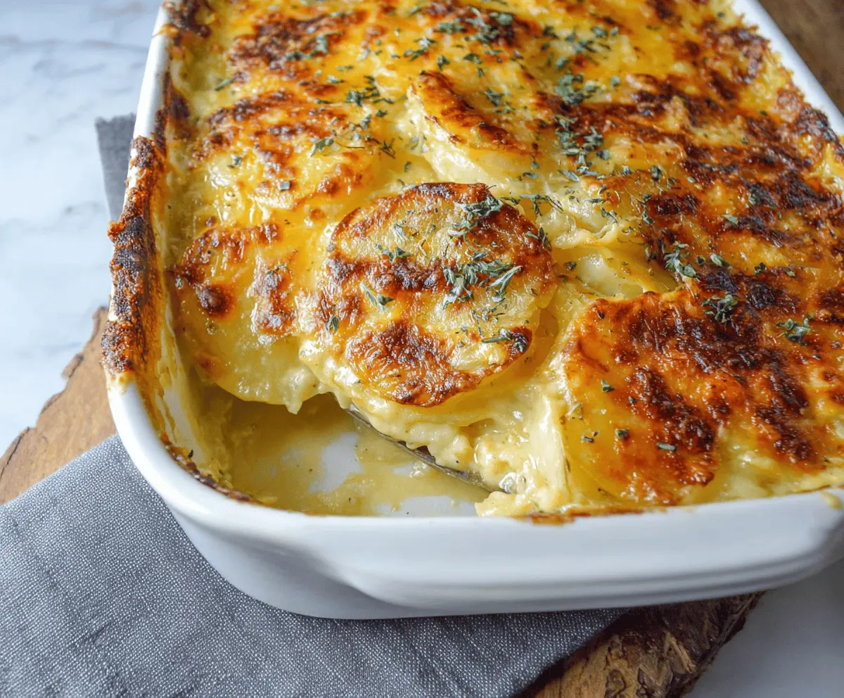 Before serving, sprinkle fresh thyme or parsley on top for a lovely garnish. Enjoy your creamy, cheesy scalloped potatoes with their perfectly browned crust and tender, flavorful layers!
