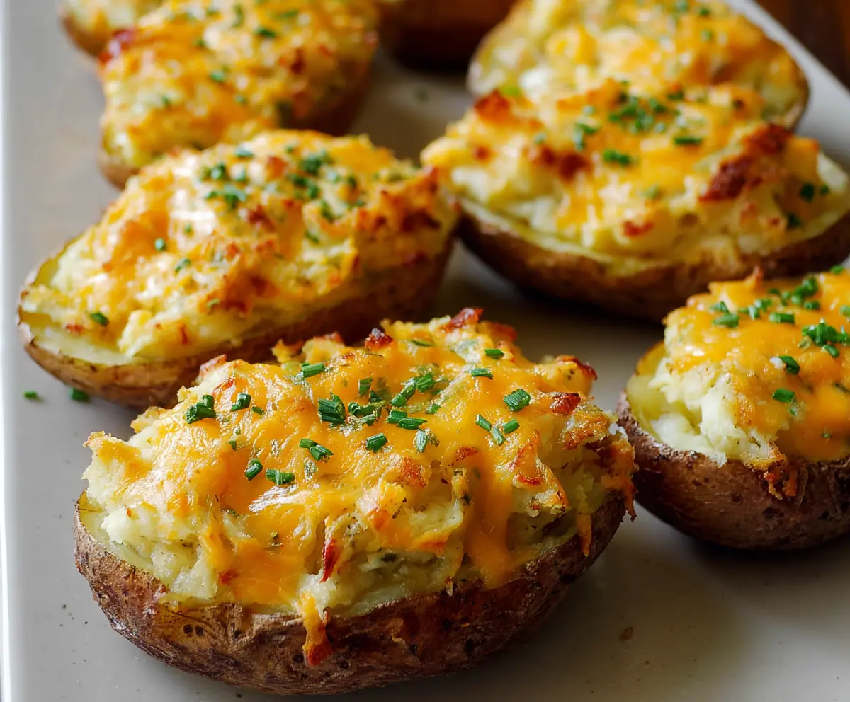 Sprinkle each stuffed potato with additional shredded cheddar cheese and the reserved bacon bits for extra flavor and crunch. Place the stuffed potatoes in a baking dish and return them to the oven at 375°F (190°C) for about 15-20 minutes, or until the cheese is melted and bubbly.