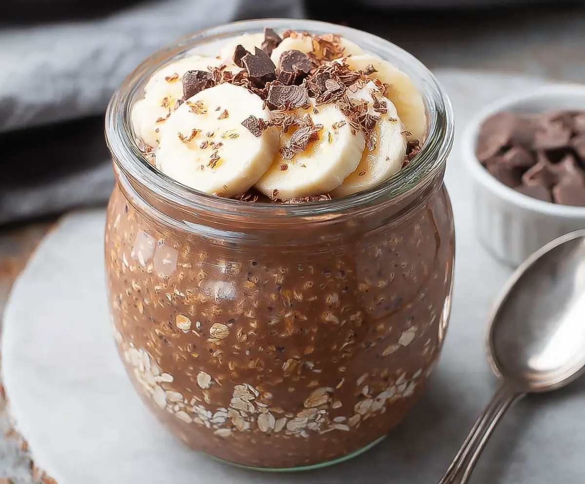 Top your overnight oats with slices of fresh banana, a dollop of Greek yogurt or whipped cream, a sprinkle of cocoa powder, and chocolate chips or chunks. You can get creative with the toppings based on your preferences!