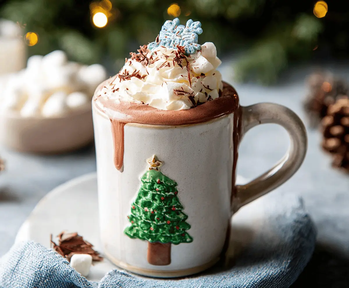 Add large marshmallows on the whipped cream and sprinkle chocolate shavings or grated chocolate on top. For a fun touch, toss in some Christmas-themed sprinkles or candies to really get into the holiday spirit.