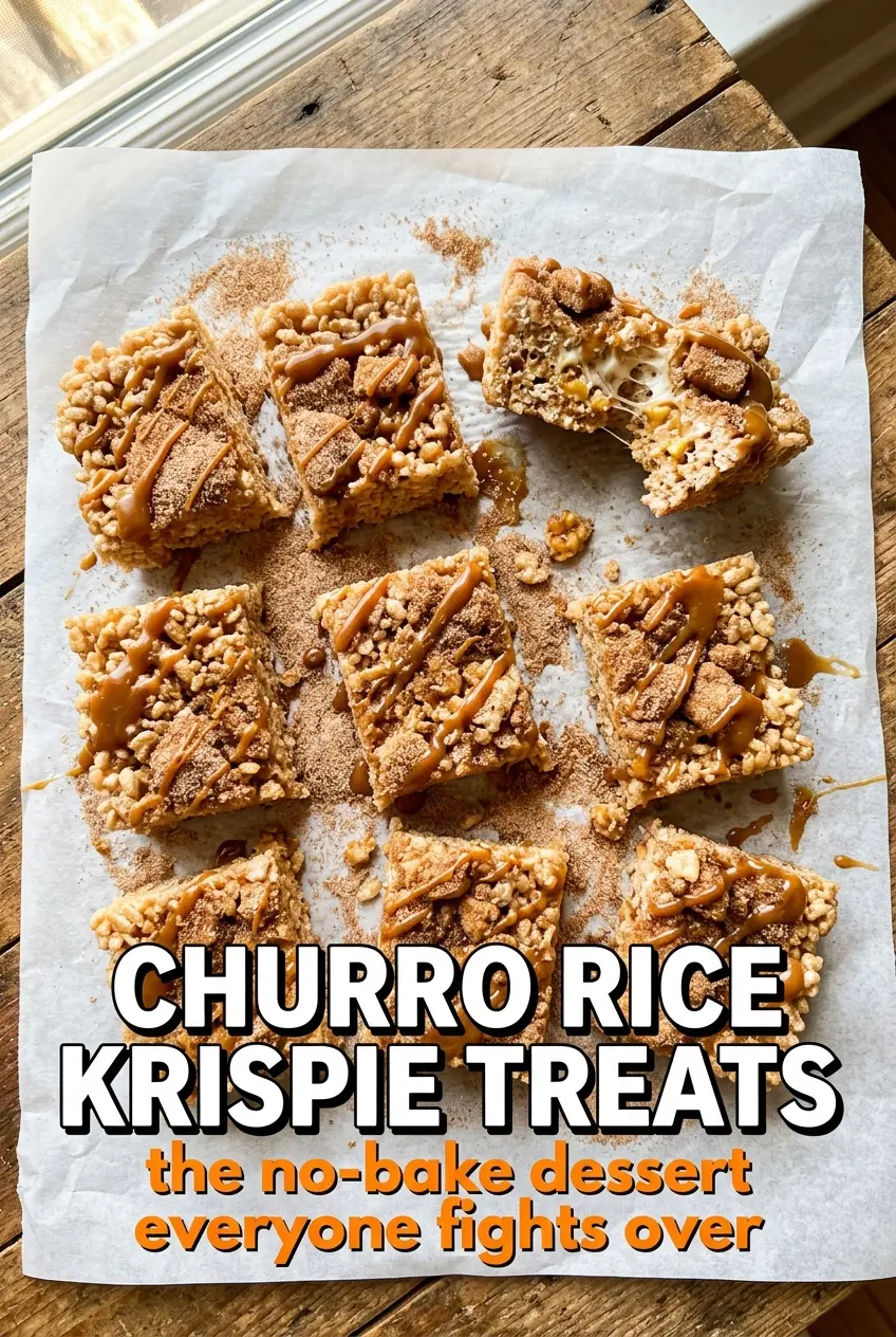 Churro Rice Krispie treats hit that sweet spot between chewy marshmallow squares and the crackly cinnamon-sugar coating you expect from a good churro. The outside gets a light crunch, the center stays soft, and every bite tastes like it should be eaten warm with sticky fingers and zero regrets.