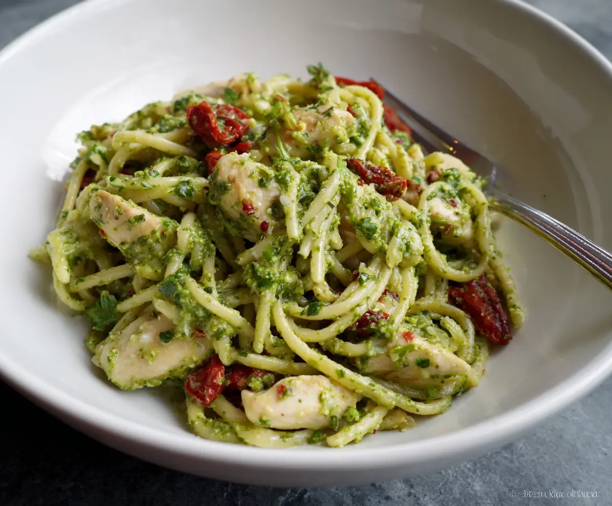 This dish is a tasty mix of juicy chicken and vibrant pesto pasta. The fresh cilantro adds a bright touch that makes every bite lively and fun!