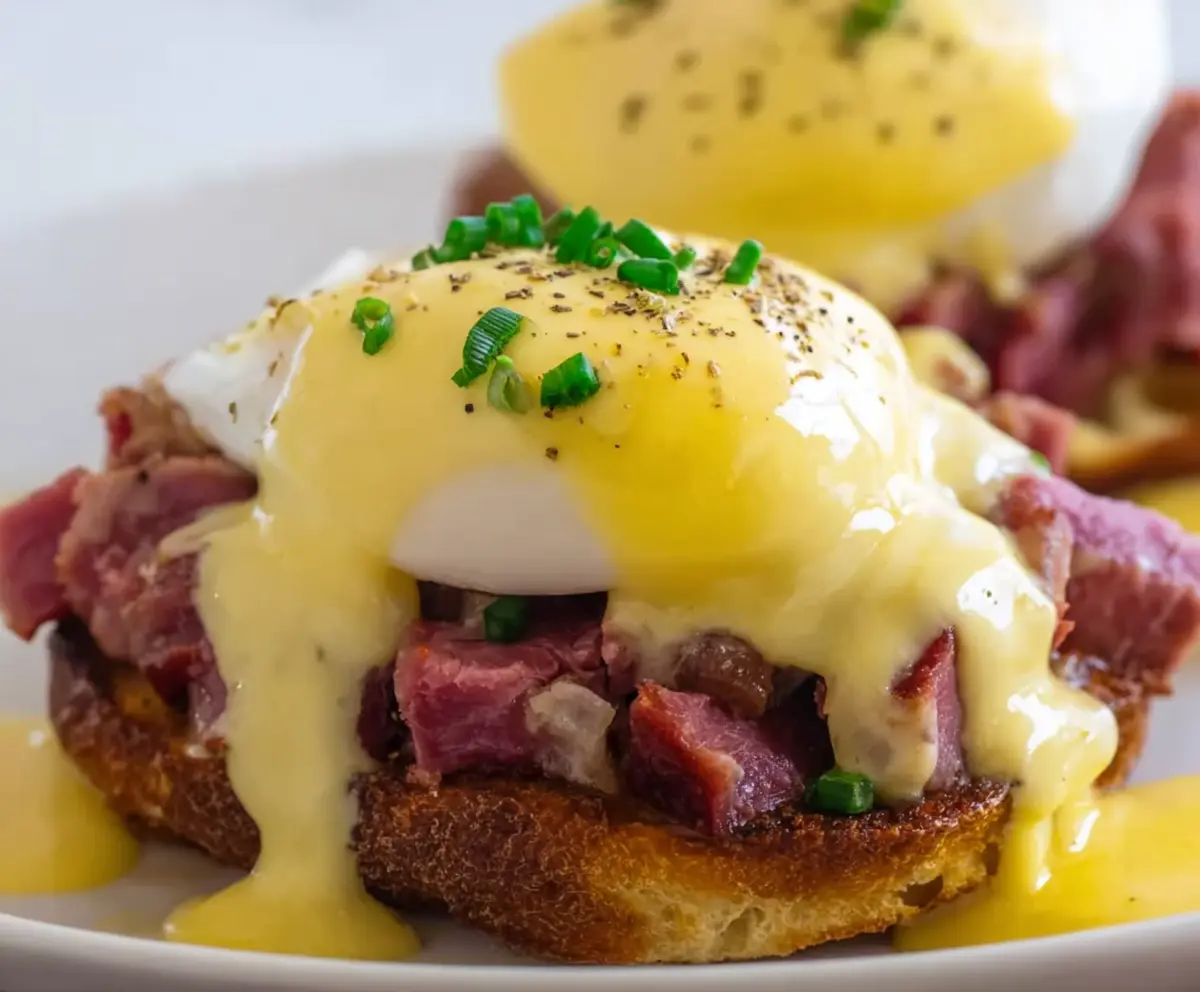 This fun twist on Eggs Benedict features corned beef hash instead of the usual English muffin. Topped with poached eggs and creamy hollandaise sauce, it’s a real breakfast treat!