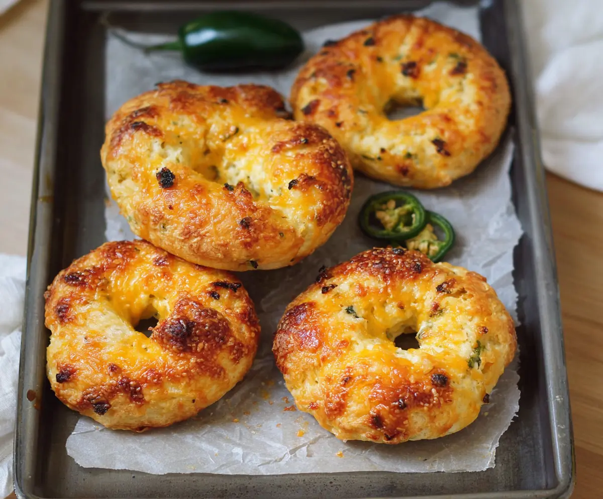 These bagels are a fun twist on the classic, packed with cottage cheese, spicy jalapeños, and sharp cheddar. They’re soft, cheesy, and just a bit exciting!