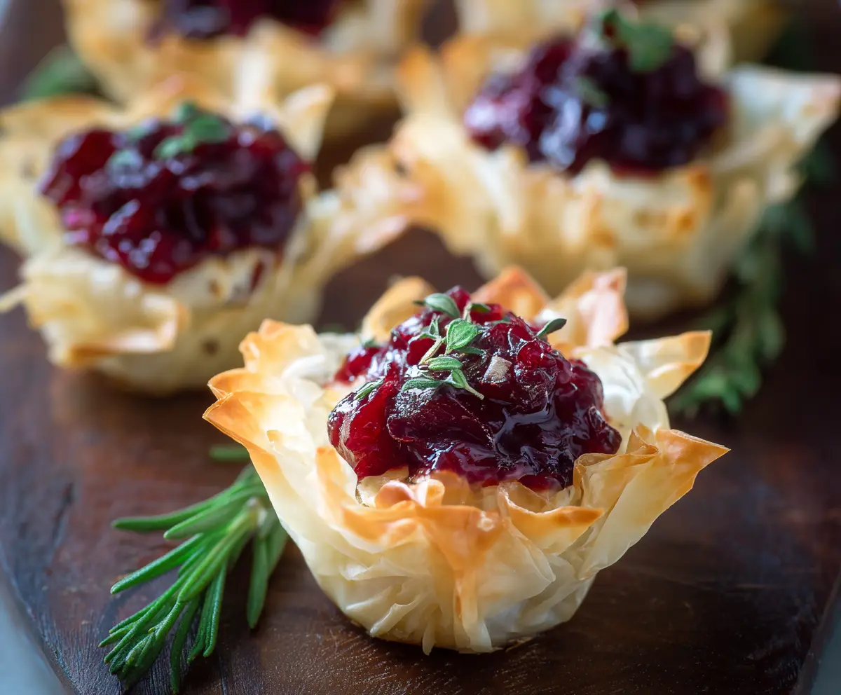 Cranberry Brie Phyllo Cups on a platter, featuring crispy golden layers filled with creamy brie and vibrant cranberry topping.