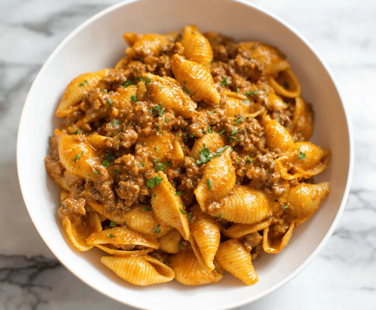 This creamy beef and shells dish is a comforting delight! It combines tender pasta shells with ground beef and a luscious cheese sauce, making it rich and filling.