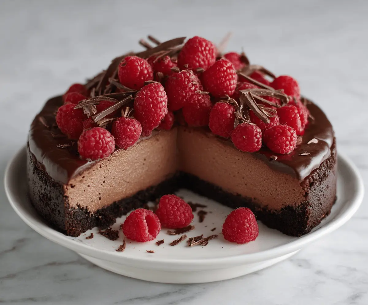 Delicious dark chocolate raspberry cheesecake topped with fresh raspberries and rich chocolate layers.