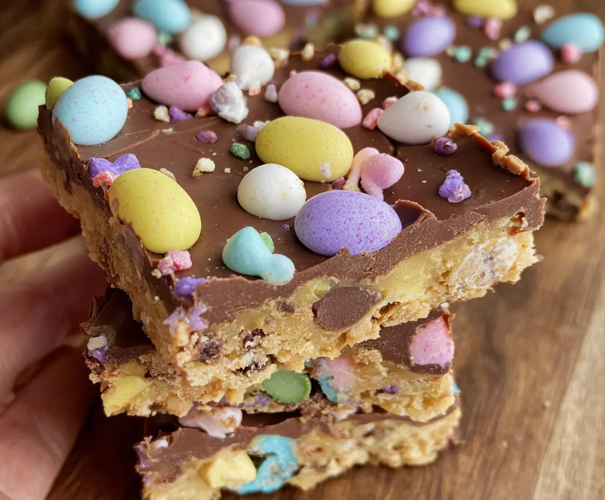Your festive Easter Goody Bars are ready! Serve them up and enjoy the chewy, chocolatey, nutty goodness with friends and family. Perfect for any spring celebration!