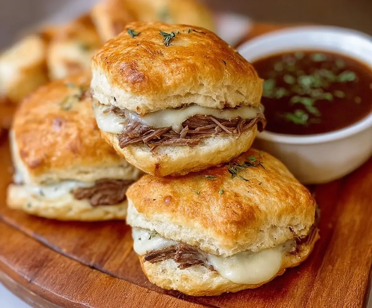 French Dip Biscuits are a fun twist on a classic sandwich! They feature tender, flaky biscuits filled with juicy slices of beef and gooey cheese. Plus, they come with a tasty dipping sauce!