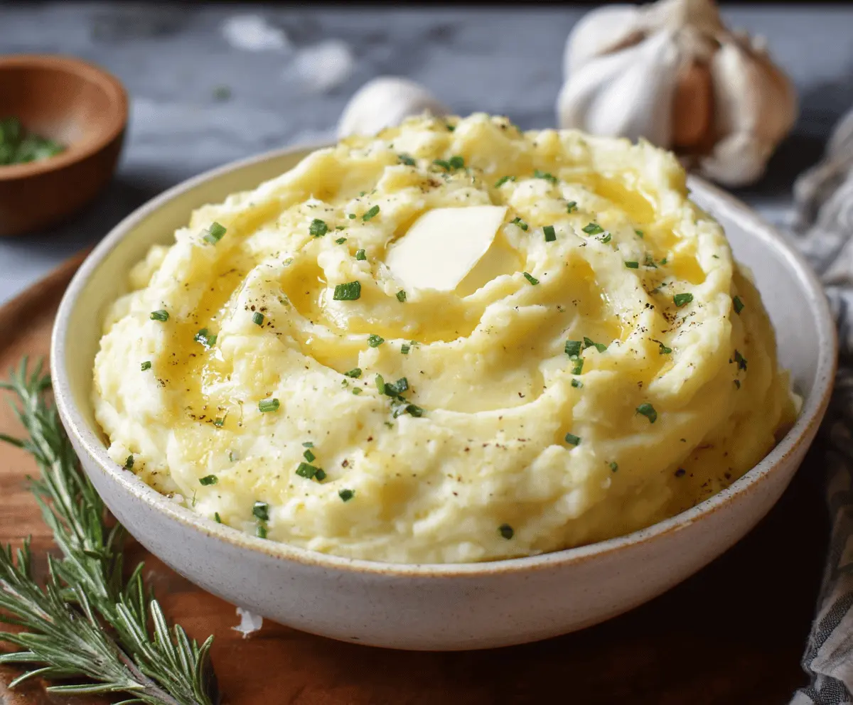 Creamy garlic mashed potatoes served as a delicious side dish for dinner.