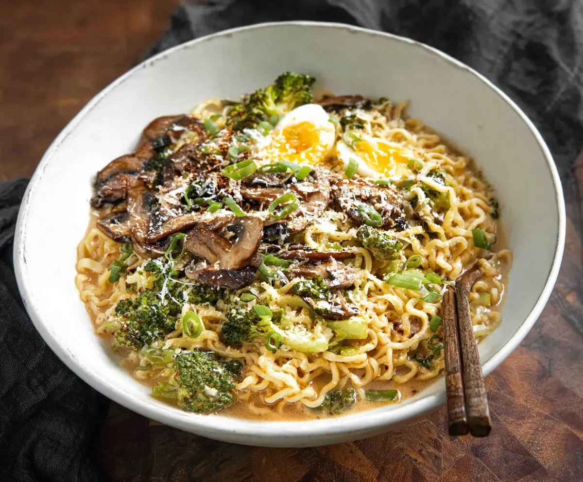 This dish beautifully combines the umami depth of garlic and mushrooms with creamy Parmesan and the comforting chew of ramen noodles, making it an easy yet special meal! Enjoy! 🌟