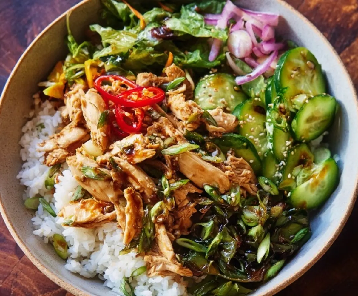Delicious Ginger and Scallion Chicken Bowl served with fresh vegetables.
