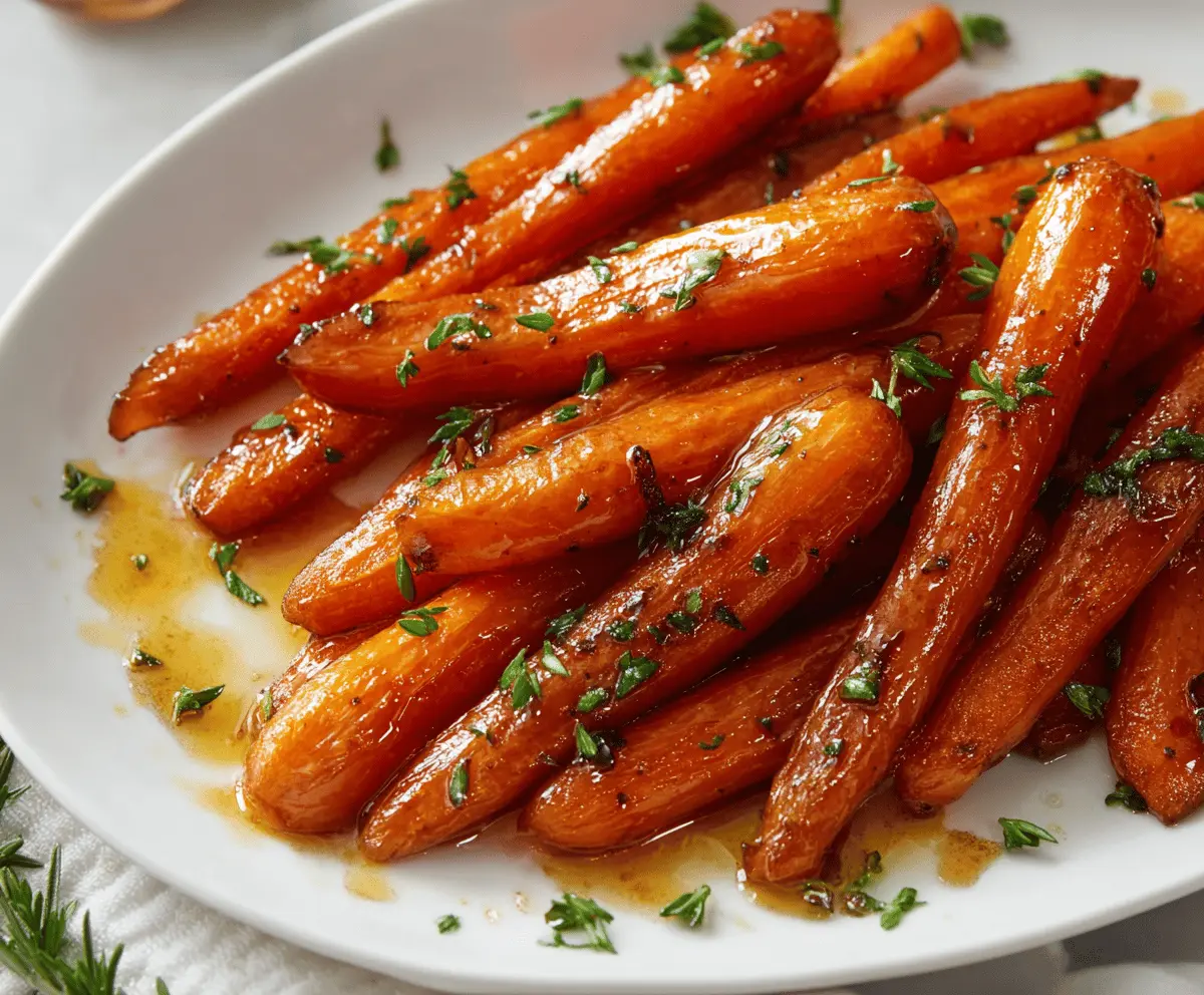 Delicious honey glazed carrots garnished with fresh herbs on a white plate.