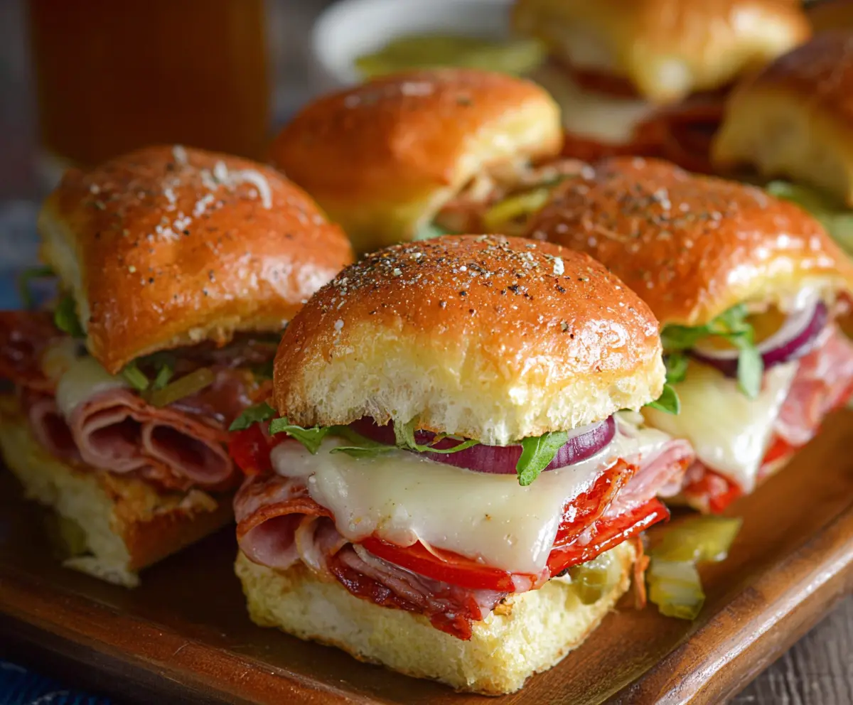 These Hot Italian Sub Sliders are mini sandwiches packed with tasty meats like salami, pepperoni, and ham, topped with gooey cheese and zesty peppers. Perfect for a fun snack or game day!