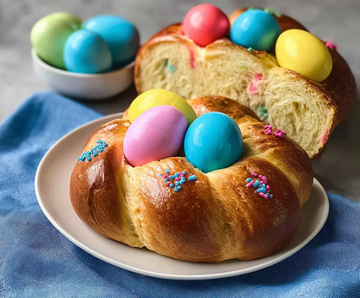 This Italian Easter Bread is a lovely treat! It’s a soft, sweet bread shaped like a wreath, with colorful eggs nestled right in it. Perfect for celebrating spring!