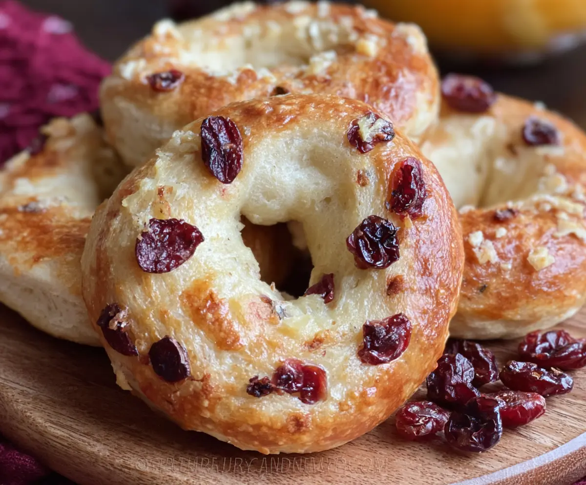 Delicious mini cranberry orange bagels with a golden crust and vibrant cranberry pieces.