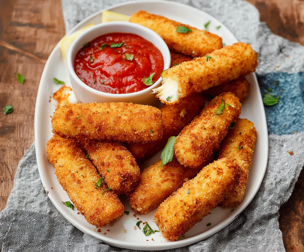These cheesy mozzarella sticks are golden and crispy on the outside with gooey cheese inside. Perfect for dipping in your favorite marinara sauce!