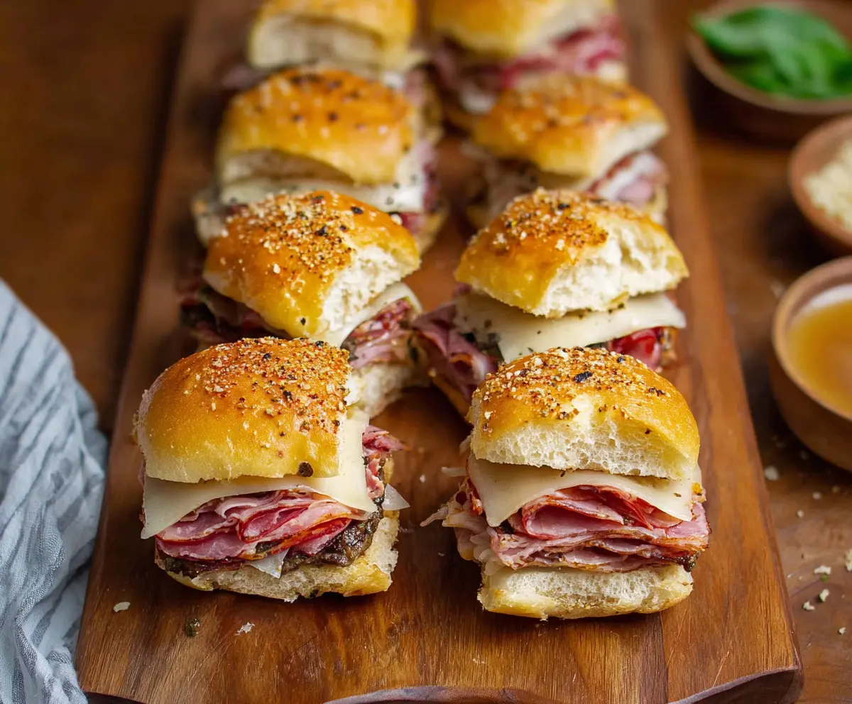 Muffuletta sliders are mini sandwiches packed with yummy layers! They have a tasty blend of meats, cheeses, and a zesty olive salad that makes each bite burst with flavor.