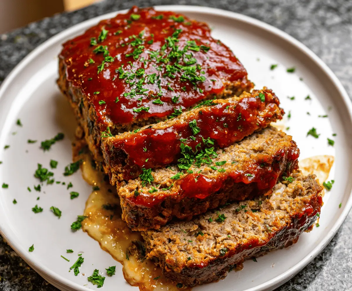 Once it’s cooked, take the meatloaf out of the oven and let it rest for about 10 minutes. This allows the juices to redistribute throughout the meat, keeping it moist. After resting, you can garnish it with fresh chopped parsley and add more ketchup on top if you like.