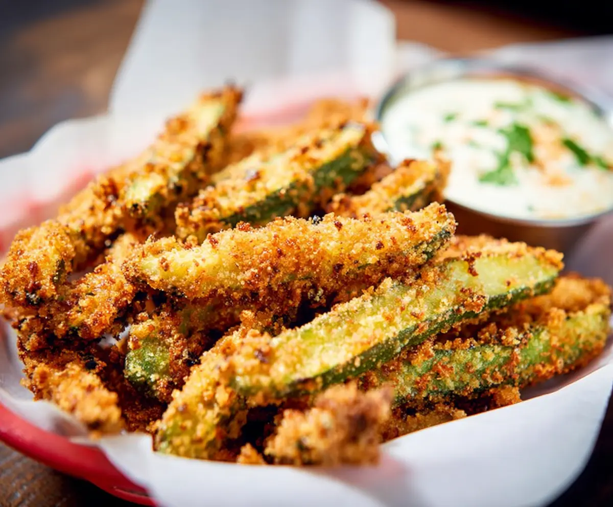 Arrange the freshly fried pickle fries on a basket or plate. Drizzle with dipping sauce if you like, and sprinkle some fresh parsley on top for a pretty touch. Serve them hot and enjoy each crispy, tangy bite with your creamy sauce!