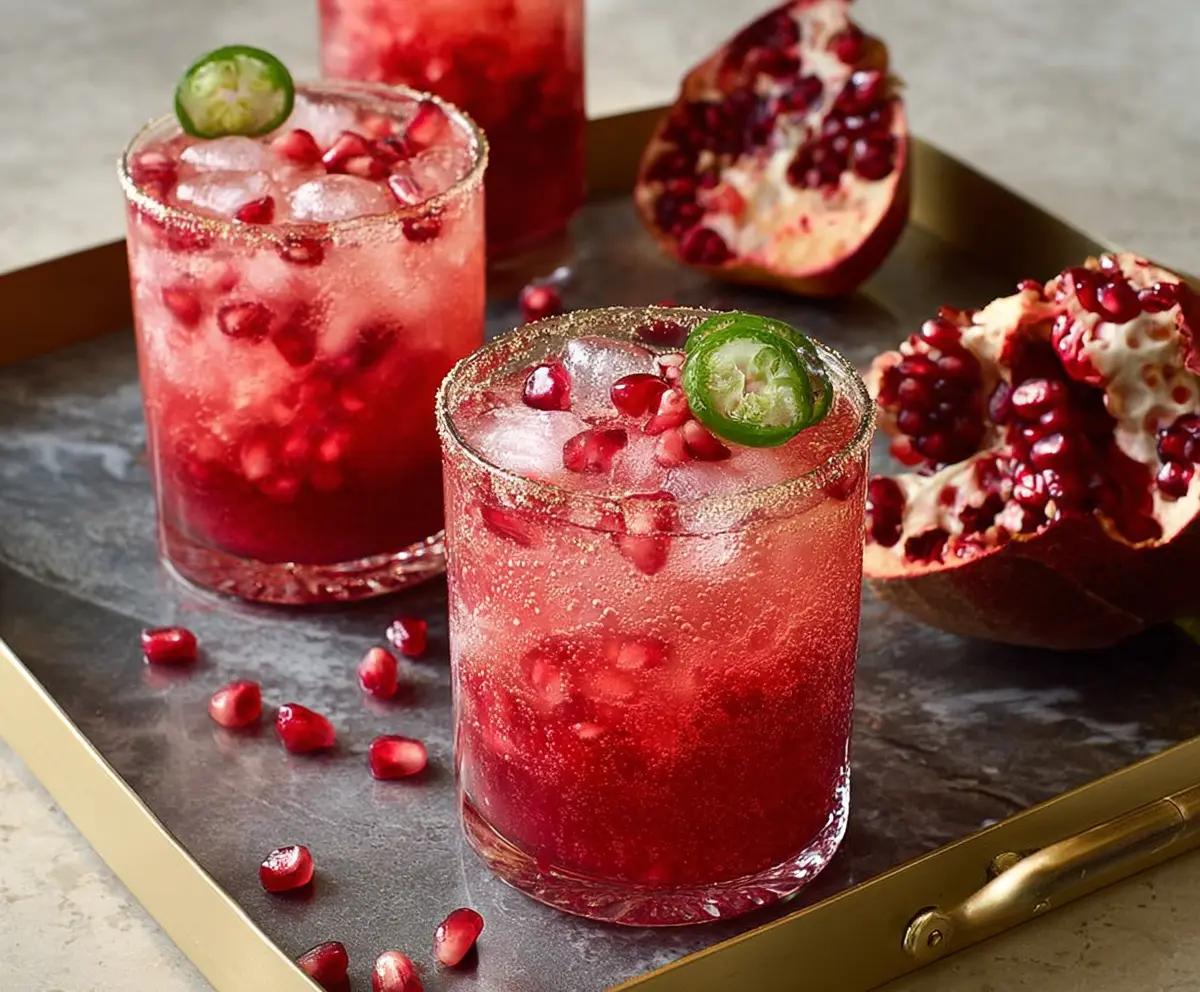 This vibrant cocktail beautifully balances the tart sweetness of pomegranate, the zing of ginger, and the subtle heat of jalapeño, all topped with a fizzy sparkle and a seasoned rim for an exciting flavor experience. Cheers! 🥂