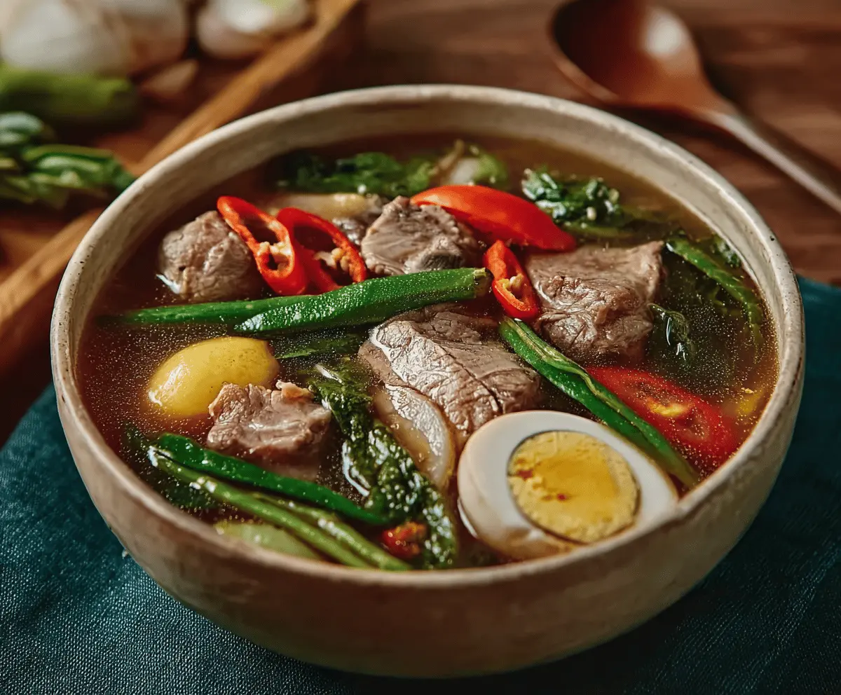 Delicious pork sinigang stew with vegetables and sour tamarind broth in a bowl