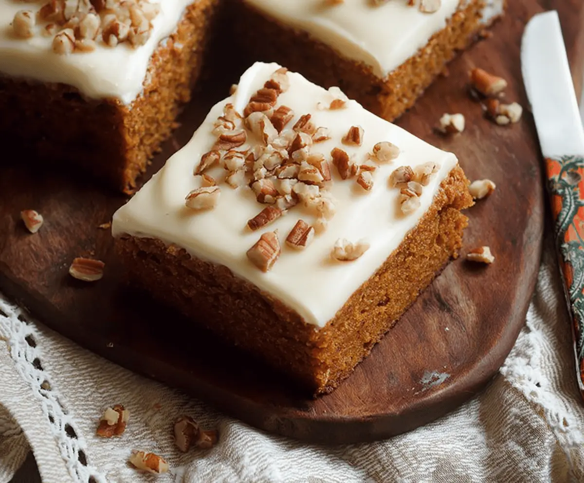 Cut the cake into squares and serve. Store any leftovers in an airtight container in the refrigerator. Enjoy every delicious bite of your moist pumpkin sheet cake with that luscious cream cheese frosting on top!