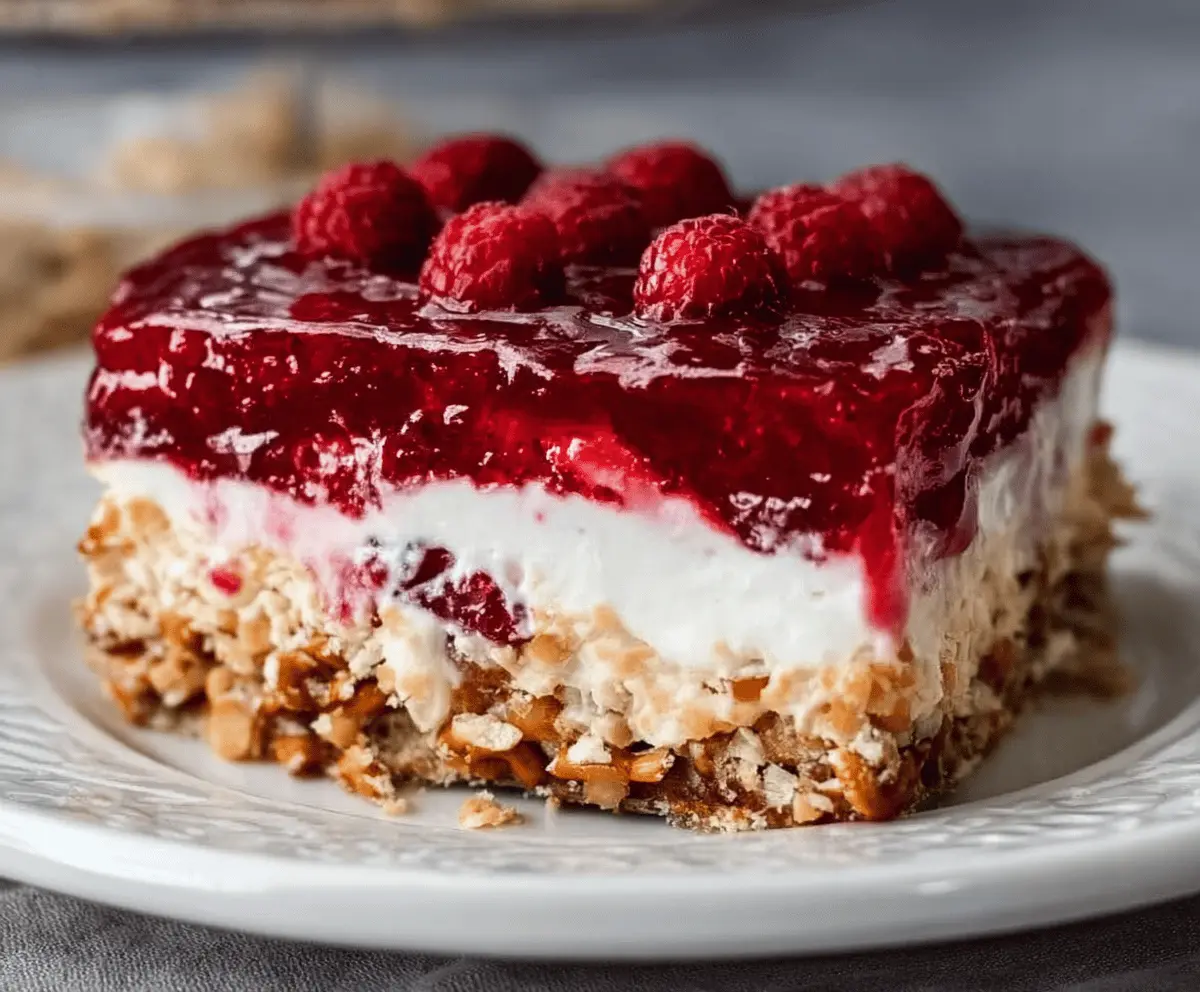 This Raspberry Pretzel Salad Cake is a fun twist on a classic dessert. It has a crunchy pretzel crust, sweet cream cheese filling, and a layer of tangy raspberry topping that’s just irresistible!