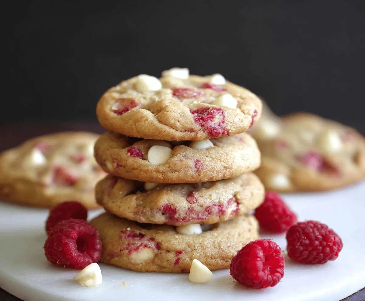 Delicious Raspberry White Chocolate Chip Cookies fresh out of the oven showcasing vibrant raspberries and creamy white chocolate chunks.
