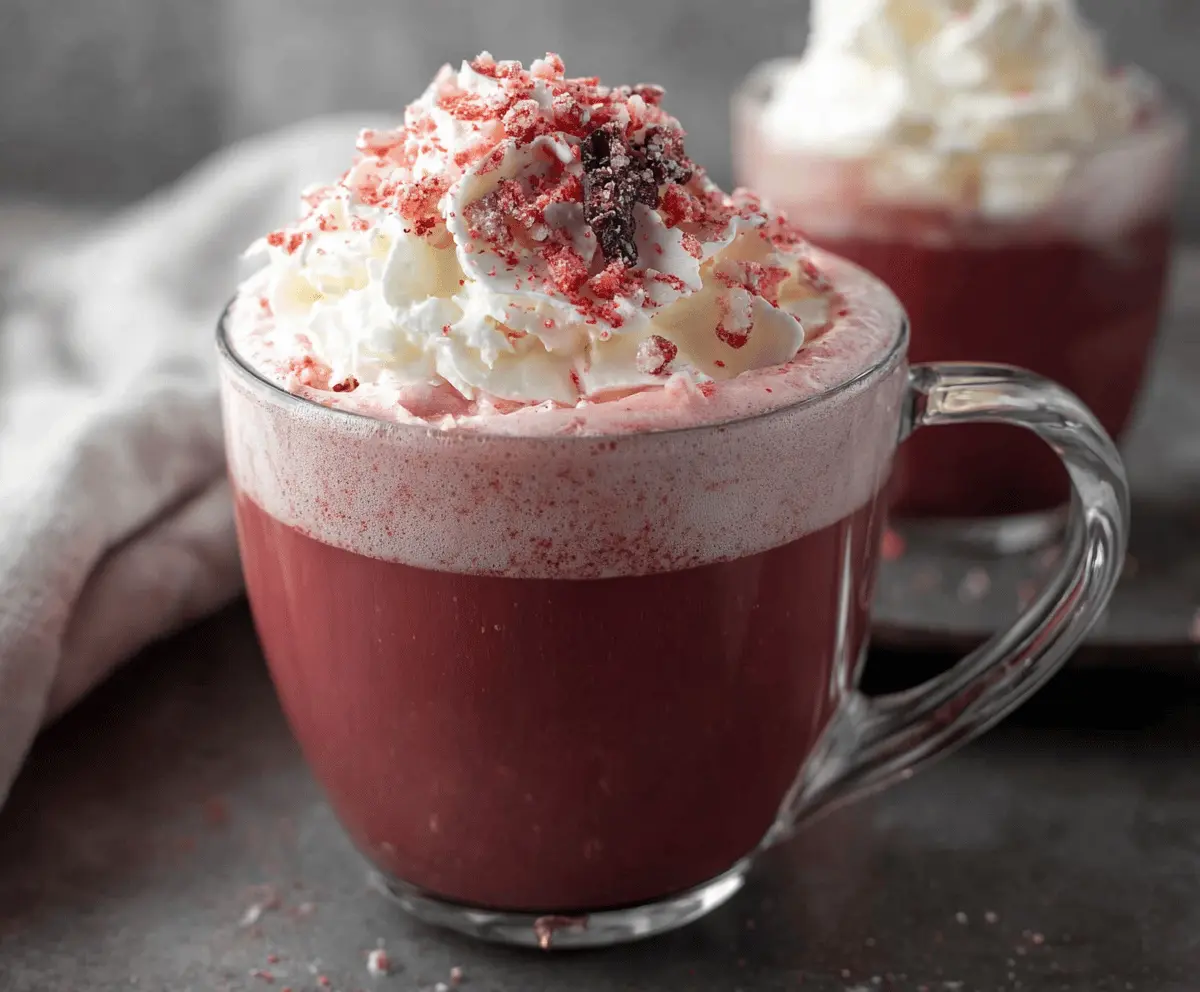 Finish by sprinkling red velvet cake crumbs or festive red sprinkles over the whipped cream for that extra special touch. Grab a cozy blanket and enjoy this delightful hot chocolate while it’s still warm!
