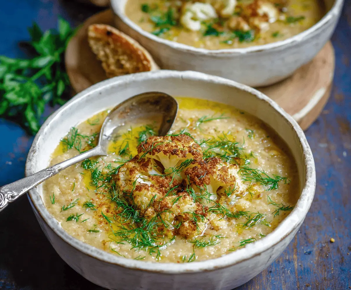 Creamy roasted cauliflower soup served in a bowl, garnished with herbs and drizzled with olive oil, perfect for a warm, comforting meal.