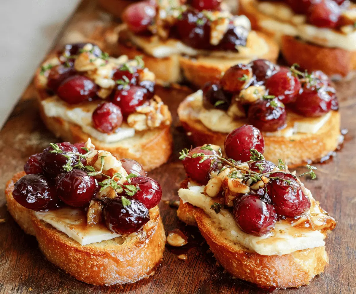 Delicious roasted grape and creamy Brie cheese crostini served on a rustic wooden platter.