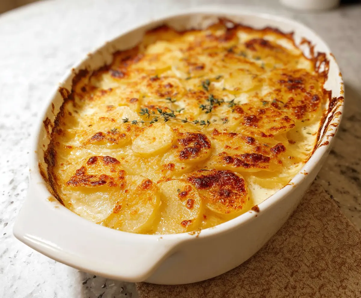 Creamy scalloped potatoes baked to perfection with golden cheese crust.