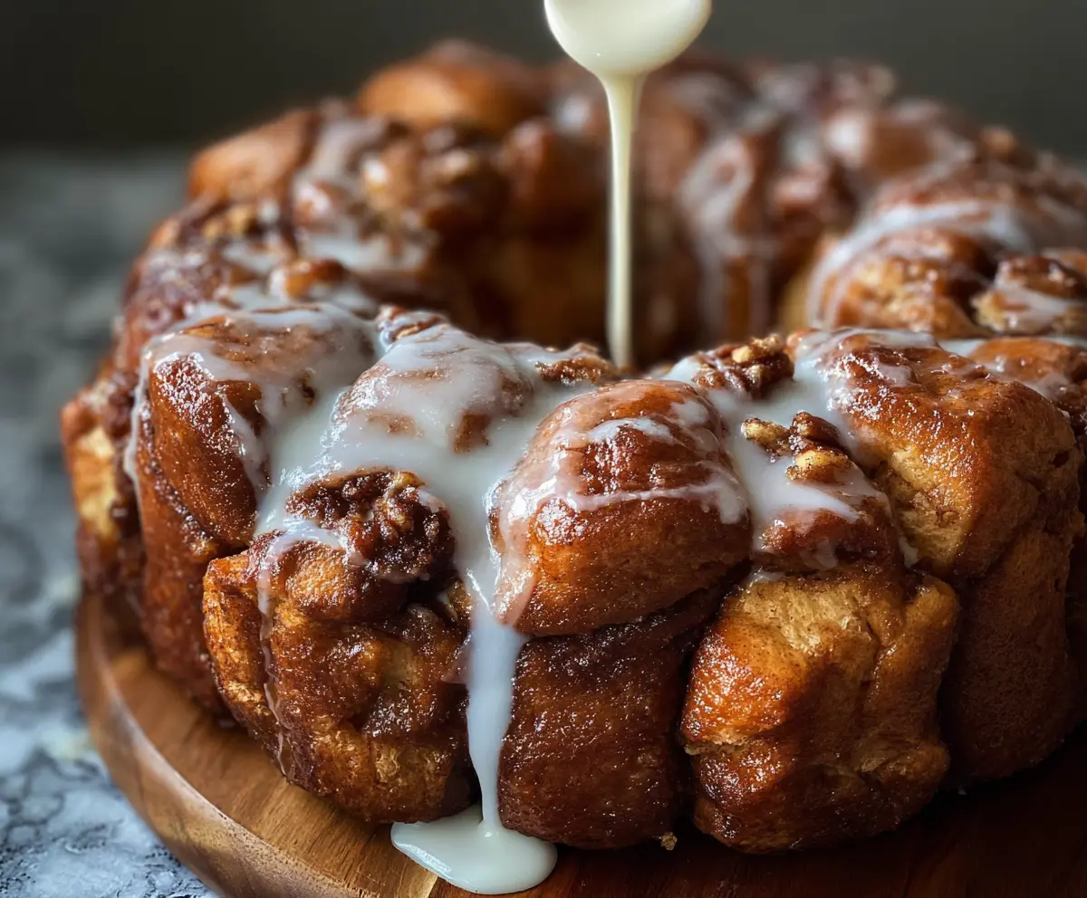 Remove the monkey bread from the oven and let it cool for about 10 minutes. Then, carefully invert it onto a serving plate. To make the glaze, whisk together powdered sugar, milk, and vanilla until smooth. Drizzle the glaze over the warm monkey bread.