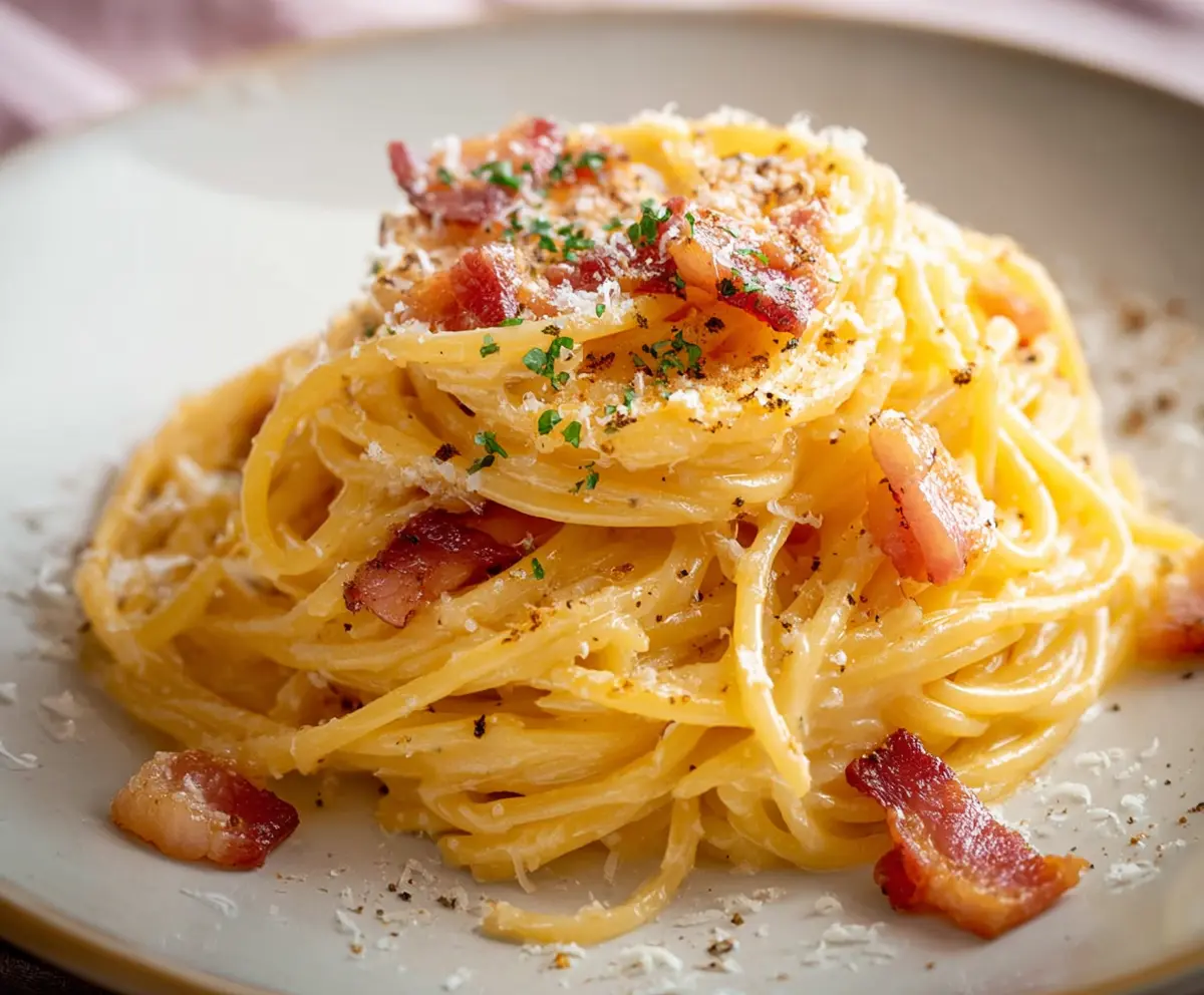 Delicious Spaghetti Alla Carbonara with crispy pancetta and creamy sauce on a white plate.