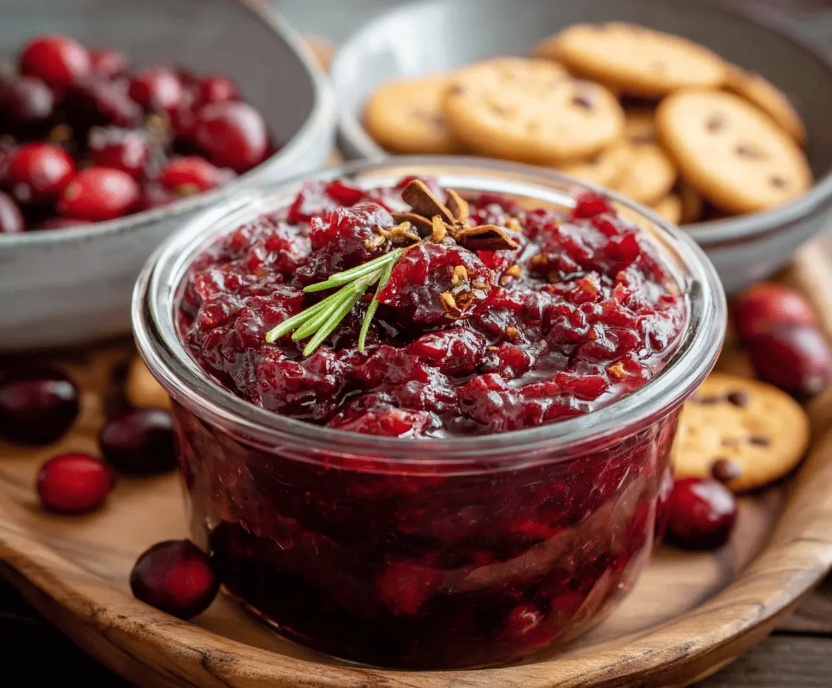 Delicious Spicy Chipotle Cranberry Chutney served in a rustic bowl with fresh herbs.
