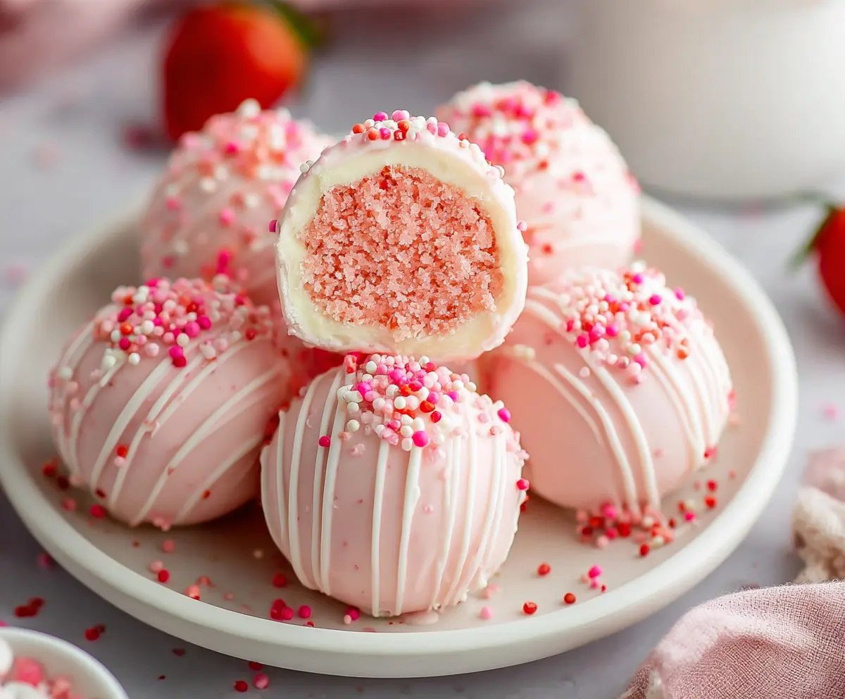 These Strawberry Cake Balls are sweet little treats that burst with fruity flavor! Made with moist cake and creamy frosting, they’re rolled into cute bite-sized balls and dusted with sprinkles.