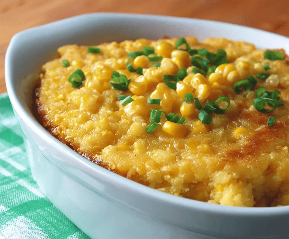 Cut into squares and enjoy this warm, creamy, and slightly sweet corn casserole as a comforting side dish for any meal!