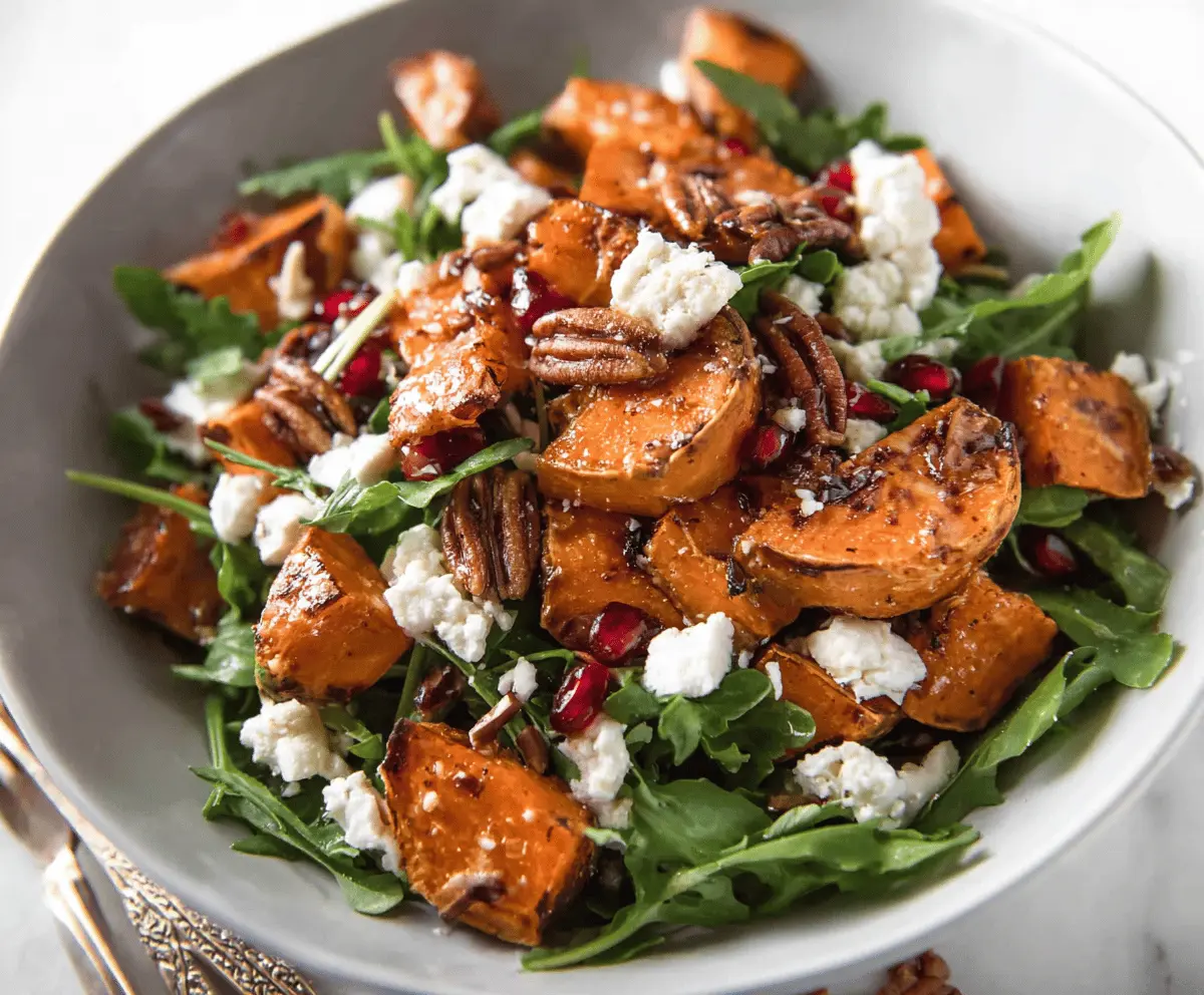 Now, dig in and enjoy this colorful, nutritious salad that combines the sweet creaminess of roasted sweet potatoes, the salty tang of feta, and the crunch of pecans, all beautifully dressed with a zingy shallot balsamic dressing!