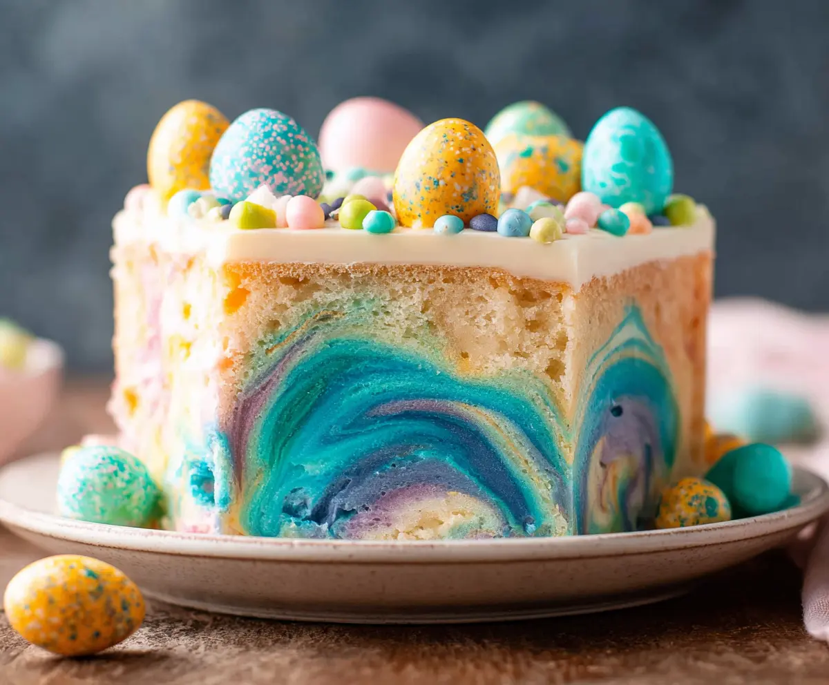 Now it’s time to reveal your masterpiece! Slice the cake carefully to show off the beautiful pastel swirls inside. Enjoy this festive Easter cake with your family and friends—it’s perfect for celebrations!