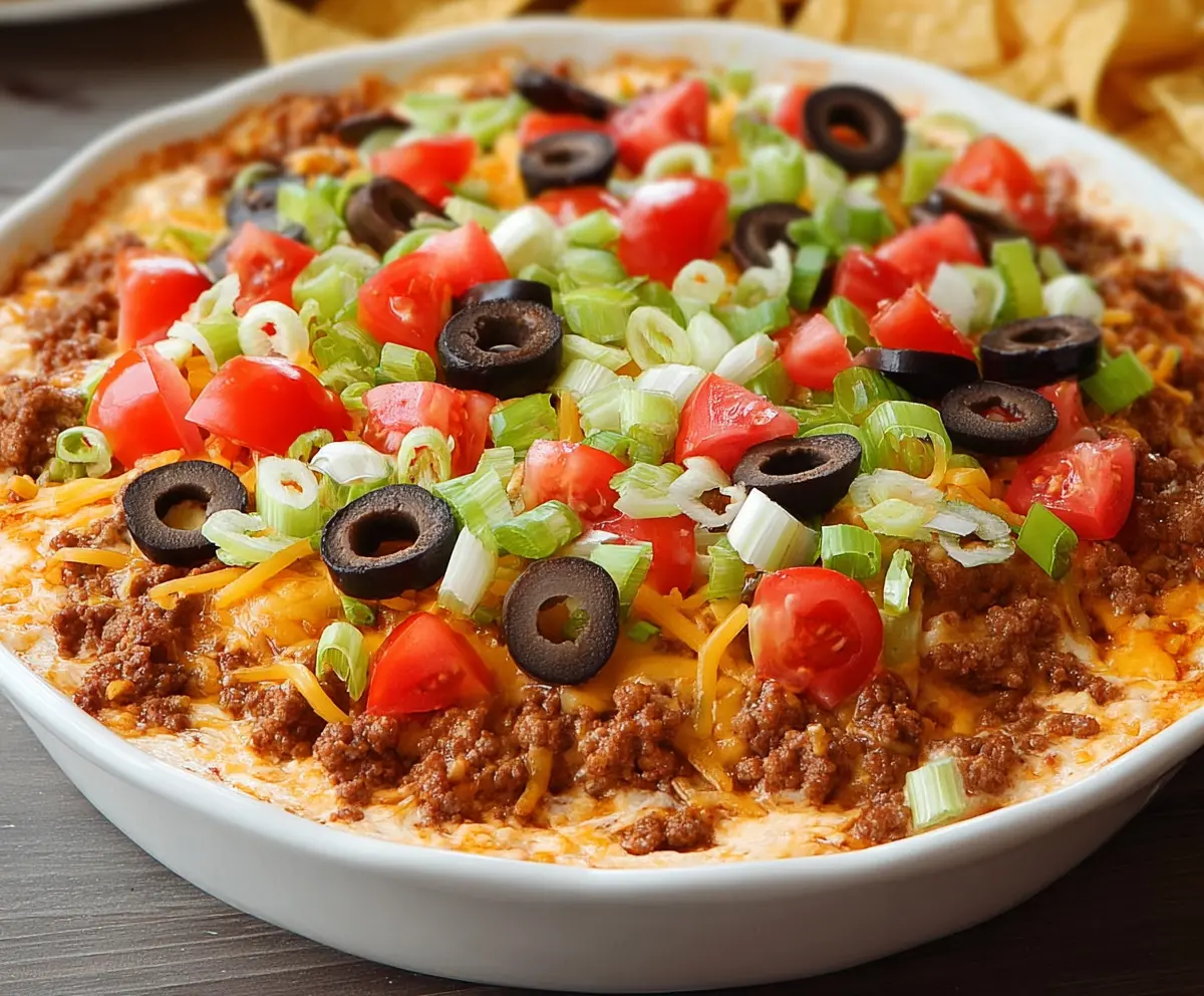 When you’re ready to serve, pair it with tortilla chips for dipping. Enjoy this delightful Taco Dip with Ground Beef at your next gathering!