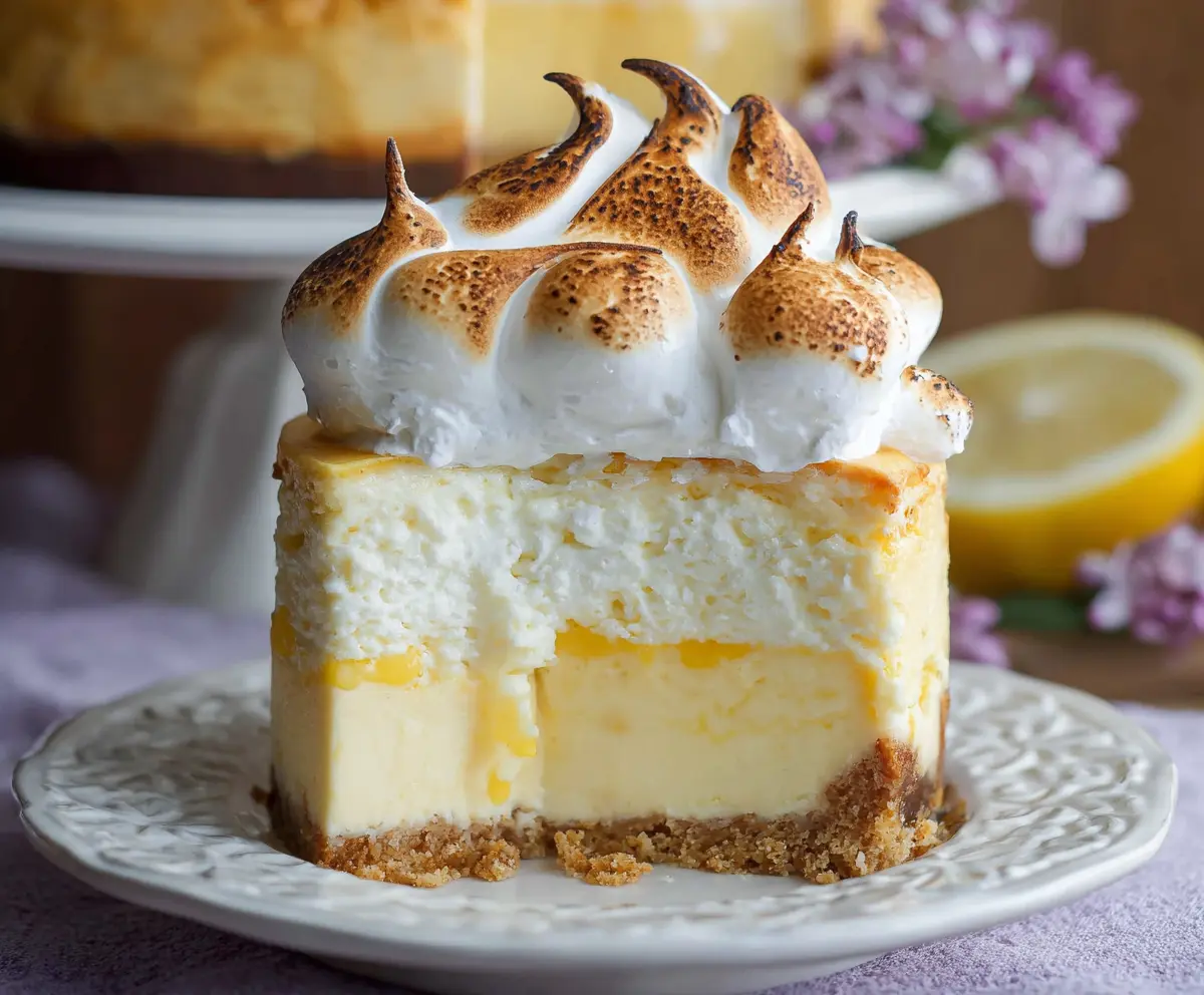 Delicious Triple Lemon Meringue Cheesecake with a crispy crust, tangy lemon filling, and fluffy toasted meringue topping